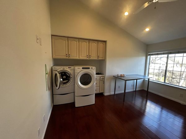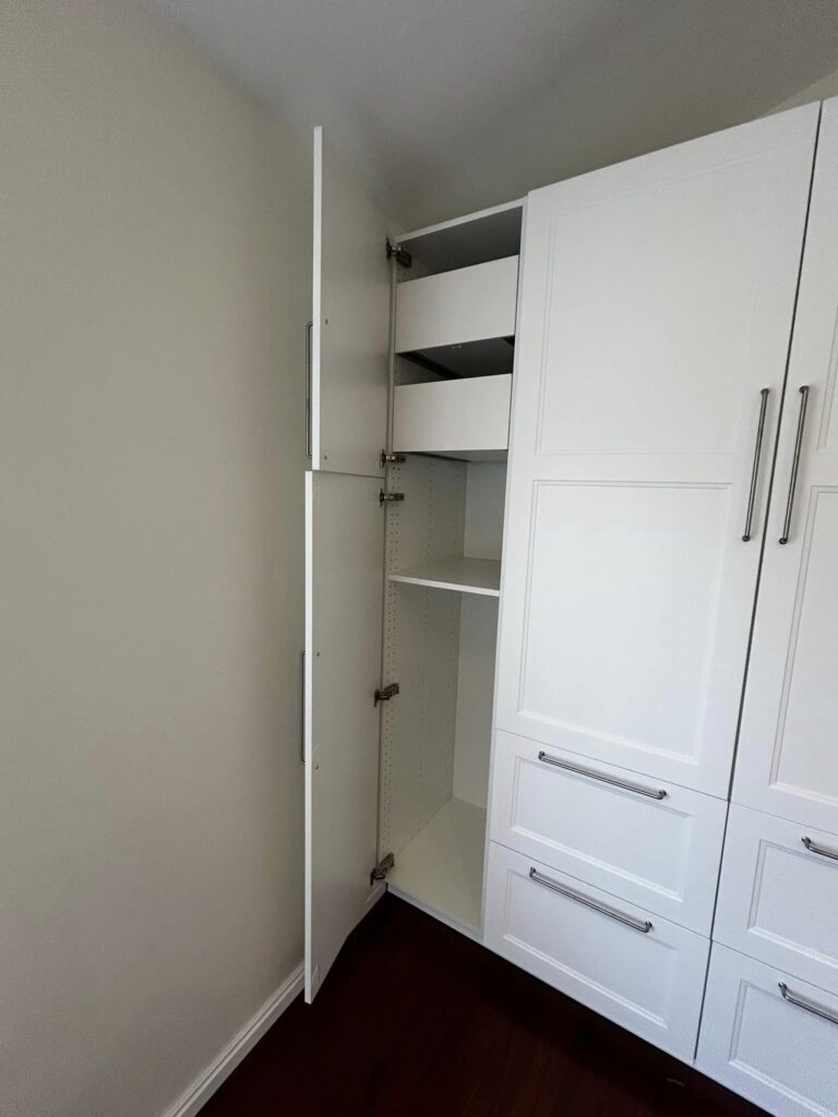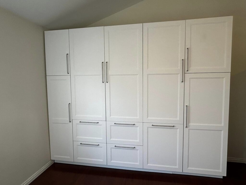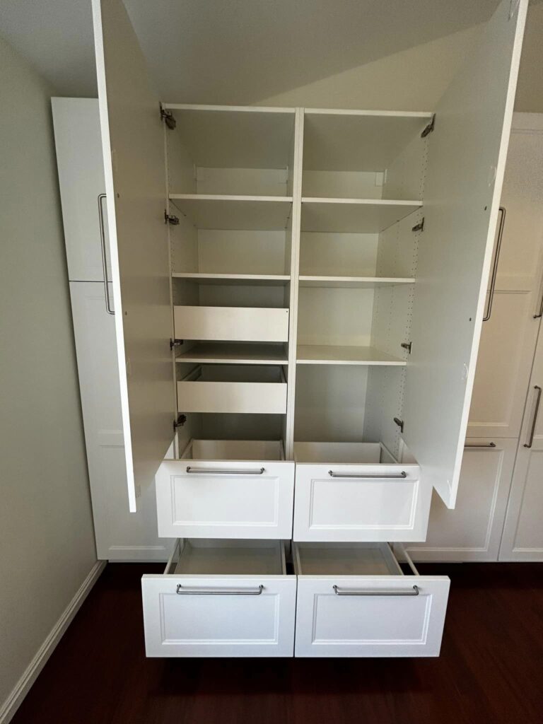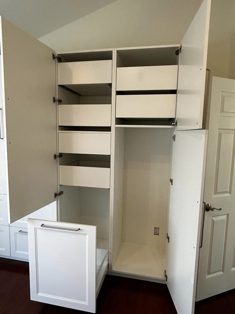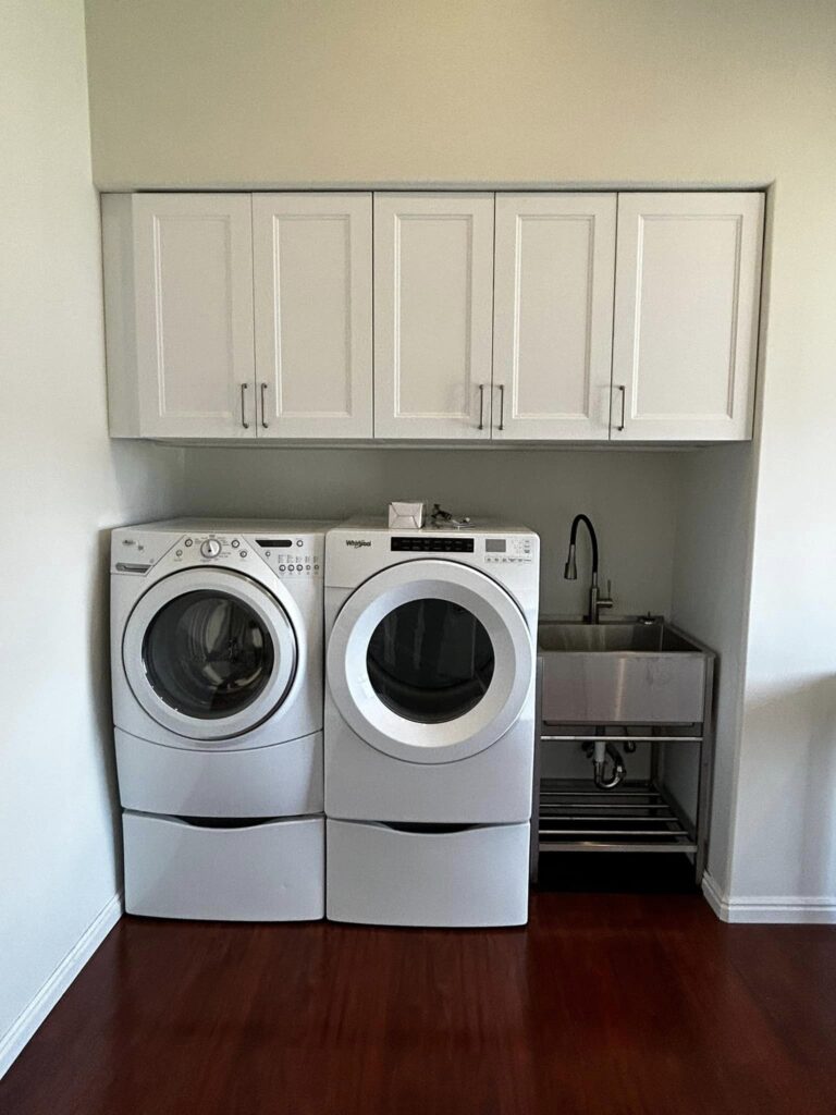 But we didn’t stop there. To maximize storage and optimize space, we installed new cabinets, elegantly suspended above the washer and dryer. These cabinets not only added a touch of sophistication to the room but also provided ample storage for laundry essentials. Additionally, we crafted a full laundry room wall outfitted with pull-out drawers and doors, further enhancing organization and accessibility. From sorting to folding, every aspect of the laundry process was streamlined with our thoughtful design and meticulous installation.