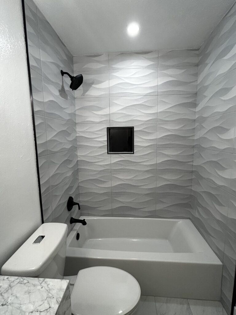Revamping a bathroom is no small feat, but it’s a task that brings immense satisfaction when executed flawlessly. In our recent bathroom overhaul, we embarked on a full bathroom tear-out, completely transforming the space from top to bottom. From installing new drains for the tub to fitting in a pristine new tub and shower/tub faucet, every aspect was meticulously handled to ensure a seamless transition. We even incorporated a sleek 14 x 14 shampoo shelf with Schluter edging for added convenience and style.