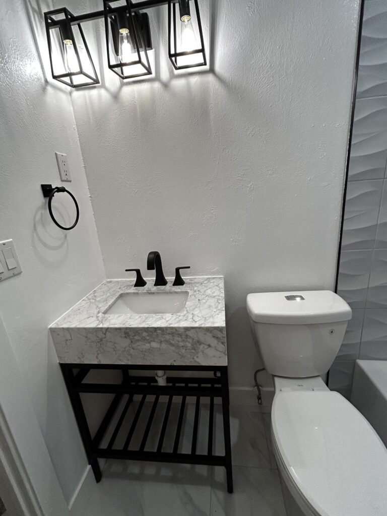 One of the highlights of this renovation was the attention to detail in every element. From the tiled surround and new tiled floor to the installation of a new vanity, toilet, and basin, no corner was left untouched. We also integrated a new light fixture above the tub, elegantly tied into the fan system, to enhance both functionality and ambiance. With a keen eye for design and a commitment to quality craftsmanship, we ensured that every component harmonized effortlessly to create a space that is not just visually stunning but also highly functional and durable.